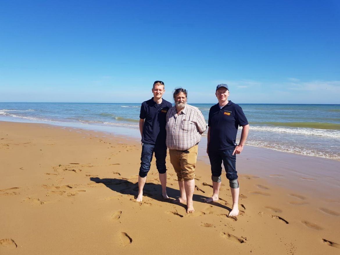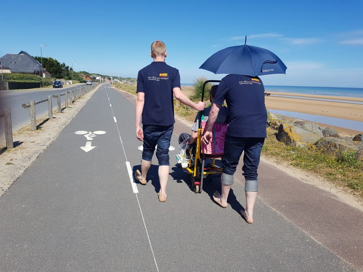 Am nächsten Tag steht dann viel auf dem Programm: Es geht an der Küste entlang und wir besuchen Omaha Beach – jenen geschichtsträchtigen Strand der D-Day Invasion. Bei bestem Wetter und warmen Lüftchen finden wir schnell einen Parkplatz direkt am Strand. Das blaue Wasser nur im Blick zu haben erscheint allen zu wenig. Und so wird die perfekte Ausstattung des Wünschewagens ihrem Sinn gerecht: Mit hochgeschlagenen Hosen und sicherem Griff tragen wir Ralf mit dem speziellen Tragestuhl über den Sand nah ans Wasser, wo alle Eindrücke nochmal stärker erscheinen. Geschützt vor der Sonne unter einem Schirm erlebt Ralf diese intensiven Momente mit seiner Familie und seinen Freunden. Danach geht es weiter: Wir besuchen noch weitere Aussichtspunkte im Verlauf der Küste, machen immer wieder mal eine kurze Pause um Sonne und Luft zu genießen. Zudem steht noch ein Besuch eines Militärmuseums auf dem Plan, in dem die geschichtlichen Hintergründe dieser Gegend, welche Ralf und Markus sehr interessieren, plastisch dargestellt werden. Gegend Abend geht es dann nach einem erlebnisreichen Tag wieder zum Hotel. Ralf ist müde. Den Abend am Hafen muss er absagen und ruht sich auf dem Zimmer aus.