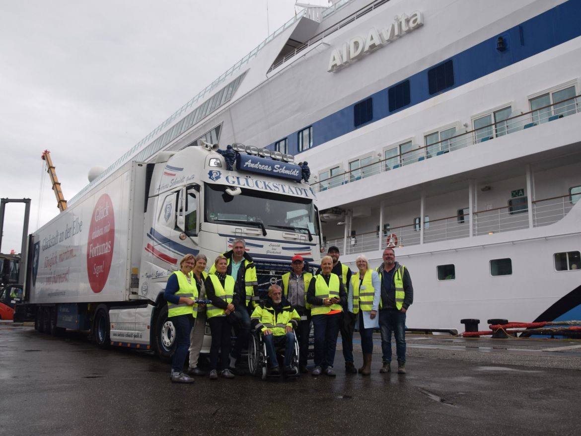 Alle gemeinsam durften wir, mit Sicherheitsschuhen und -westen ausgestattet, in den Sicherheitsbereich auf die Pier gehen. Dort wurde die AIDA Vita, die Reimer schon von vielen Arbeiten kannte, beladen. Alle Kollegen, die Reimer kannte, ob von der AIDA oder der Andreas Schmidt GmbH, kamen vorbei. Die Freude war groß, mit den Kollegen zu reden.